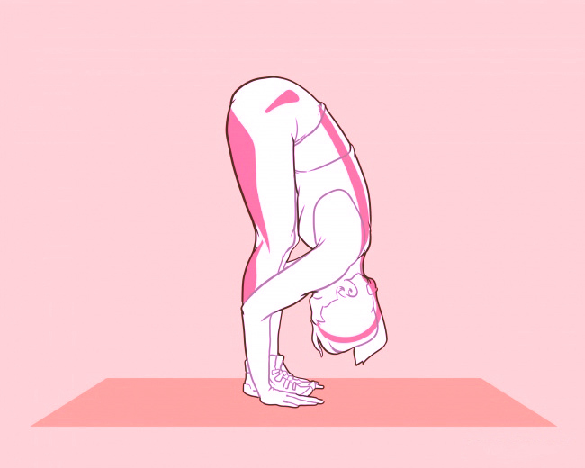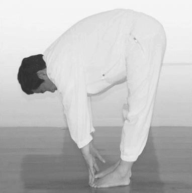 2. Потянитесь туловищем вперед, не сгибая коленей. Посмотрите вверх и наклонитесь вперед и вниз, пытаясь достать руками до пола. Почувствуйте, как вытягиваются мышцы поясницы. Взгляд, направленный вверх, помогает удерживать прямое положение спины. Вернитесь в исходное положение.